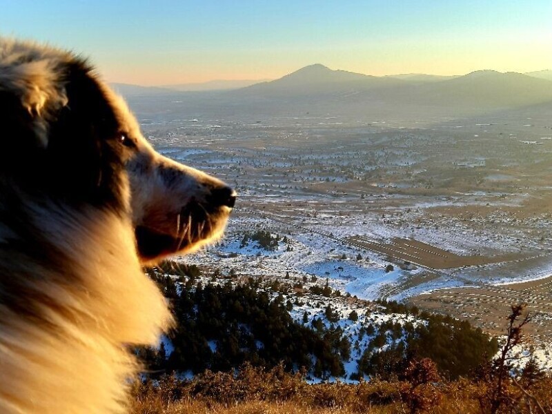 #RuralFoto #Životinje, Na slici je pas koji gleda prema dolini prekrivenoj snijegom i planinama u daljini. Sunce zalazi, stvarajući tople zlatne tonove na horizontu i naglašavajući mirnu, zimsku atmosferu pejzaža.