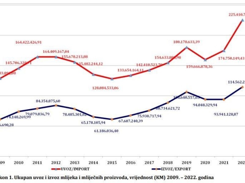 Ukupan uvoz i izvoz mlijeka i mliječnih proizvoda u BiH u periodu 2009. - 2022. godina, vrijednost u markama (KM)... Malo li je!?