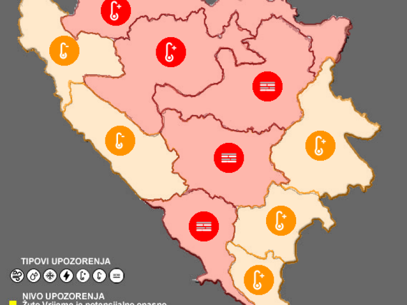 Crveni meteoalarm na snazi je širom Bosne i Hercegovine, osim u planinskim područjima. Odnosi se na period od 12. do 16. avgusta, od 12:00h do 17:00h.