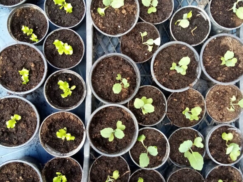U saksijicama u gajbici je kupus, a pored gajbice je salata.