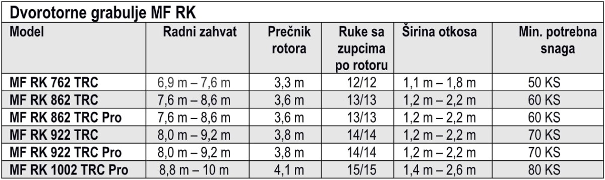 Veoma cenjenoj seriji modela MF RK pridružuje se šest novih sakupljača sa dva rotora sa skupljanjem u sredini koji nude radne širine od 6,9 – 7,6 odnosno sve do 8,8 – 10 metara.