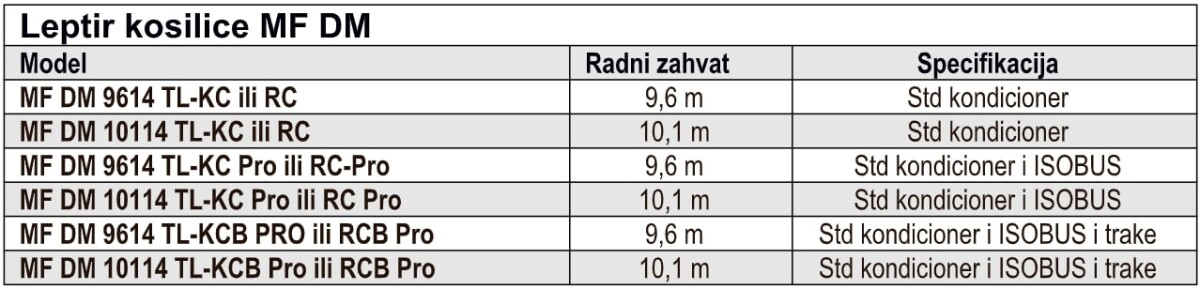 Projektovane i proizvedene za velika poljoprivredna gazdinstva, profesionalne korisnike i ugovarače, leptir kosilice MF DM 9614 i MFDM 10114 dostupne su sa širokim rasponom elemenata koji odgovaraju svim zahtevima. Novi modeli dodatak su seriji modela MF DM. Postojeći modeli MF DM 8612 TL i MF DM 9614 TL i dalje su dostupni svima kojima trebaju lakše ili manje kosilice s kondicionerom.