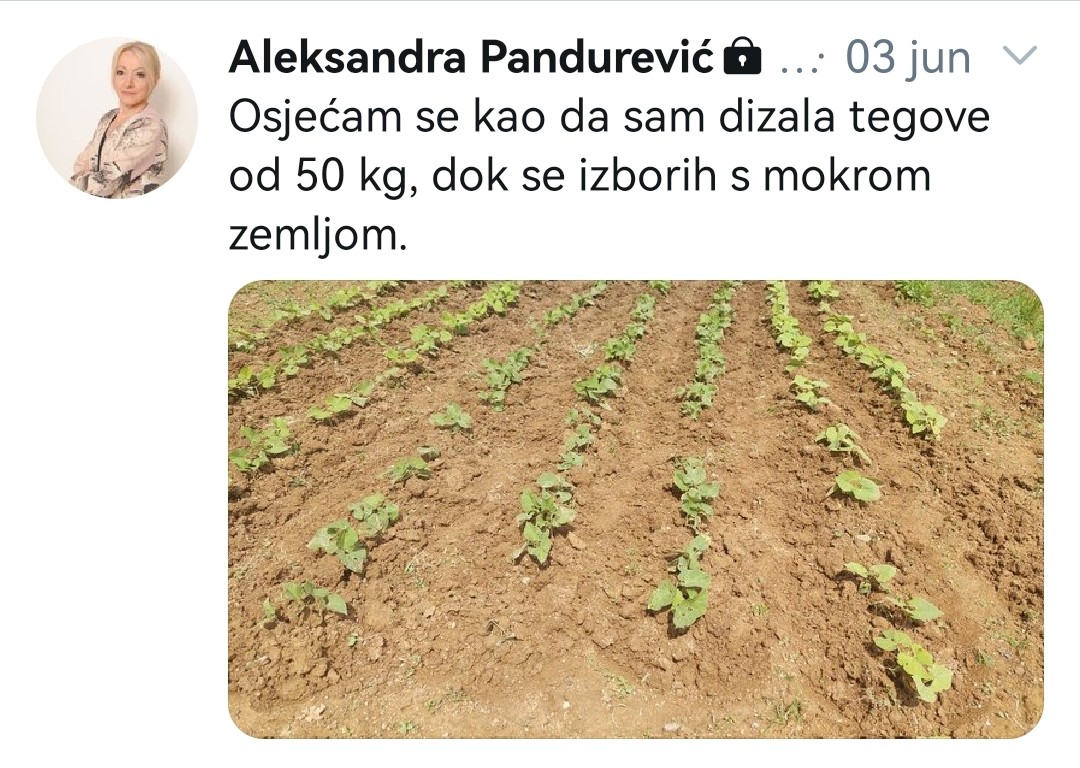 Nekadašnja državna parlamentarka, Aleksandra Pandurević, za mandata je važila za jednu od najatraktivnijih zastupnica, britka i oštra za govornicom. Pravi bum u medijima izazvala je prije nekoliko godina svojom objavom iz bašte. Čini se kako je balkanskom mentalitetu bilo teško dokučivo da političarka uzme motiku. Ali, ne treba kriviti pojedince, jer ko je, uostalom, od političara napravio najveći jet set?