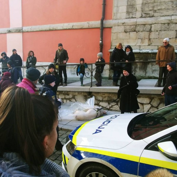 "Malo prije 14 sati policajci PU Ljubljana su obaviješteni da ženska osoba po tlu vuče leš praščića", medijima je potvrdila Maja Ciperle Adlešič, predstavnica za odnose s javnošću na Policijskoj upravi (PU) Ljubljana. Reagirali su policajci koji su žensku pratili i ispitali na Miklošićevoj cesti.